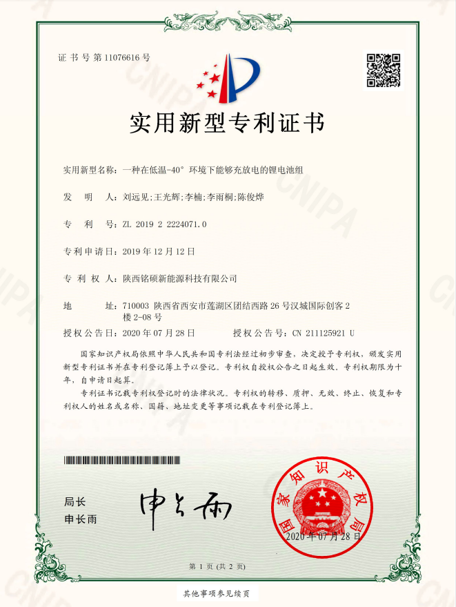 公司目前擁有產(chǎn)品專利多項;獲得AAA級信用企業(yè)證書、GJB9001C-2017武器裝備質(zhì)量管理體系認(rèn)證證書。2020年入庫科技型中小企業(yè);在第六屆中國創(chuàng)新挑戰(zhàn)賽暨中關(guān)村第五屆新型領(lǐng)域?qū)n}賽“超低溫鋰離子二次電池”榮獲優(yōu)秀獎;在第十一屆中國創(chuàng)新創(chuàng)業(yè)大賽(陜西賽區(qū))獲得新能源成長組第一名且在全國總決賽中成功晉級50強。2023年入庫創(chuàng)新型中小企業(yè)。